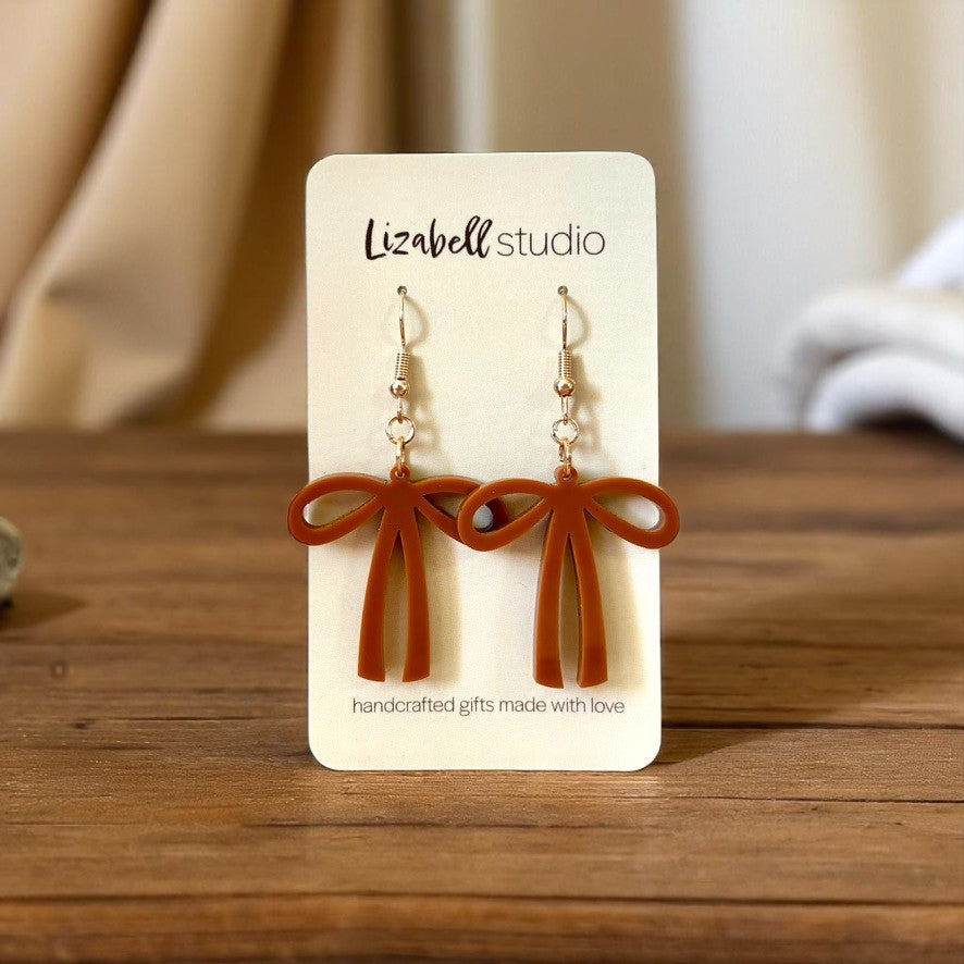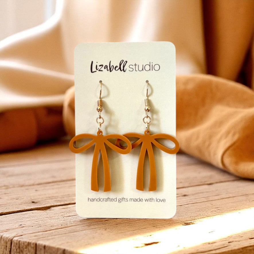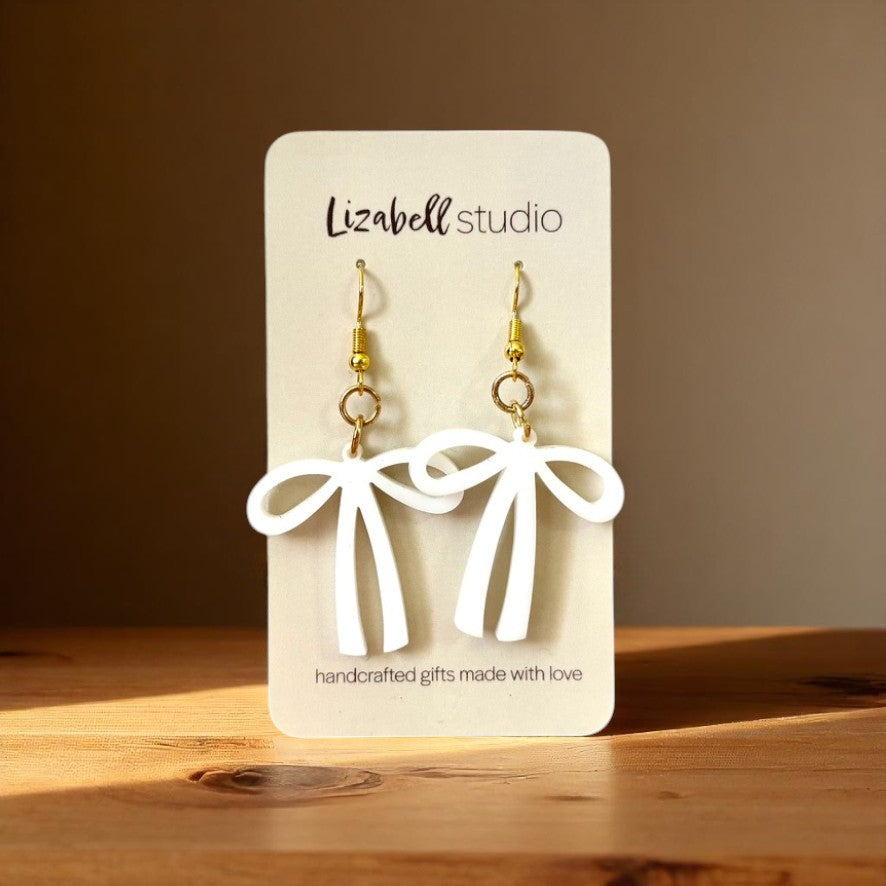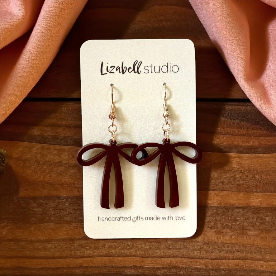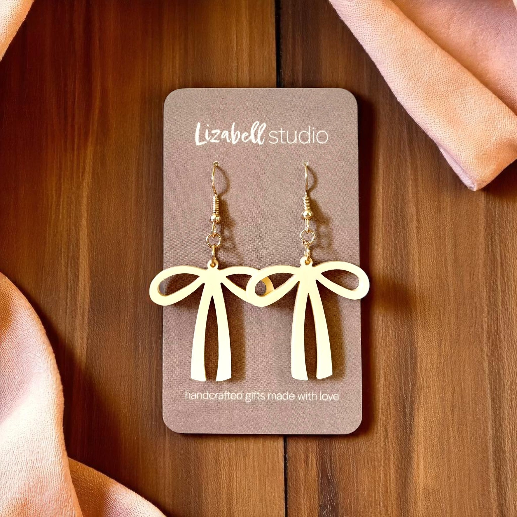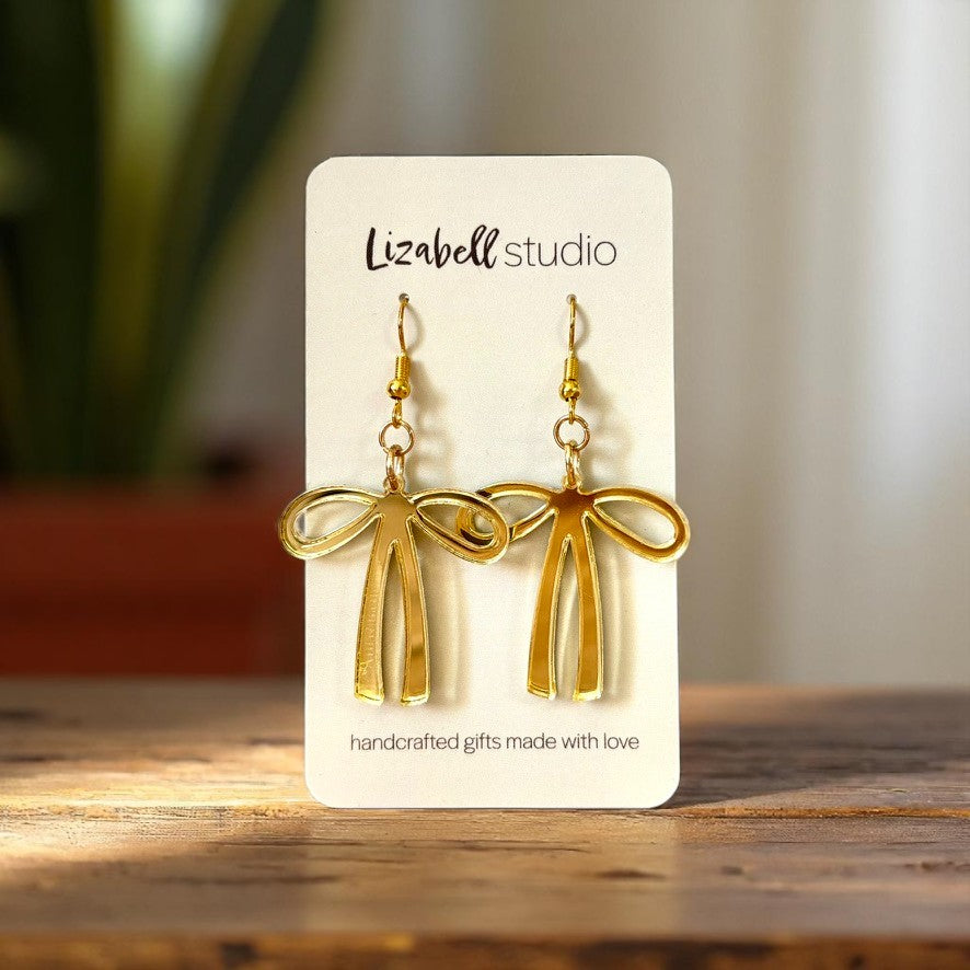 Our Bella Bow Earrings are a fresh take on the classic bow, crafted with acrylic mirror and various colored acrylic for beautiful reflective everyday wear. Each pair is cut with precision and finished by hand, giving them a uniquely delicate look while remaining bold in shape.
