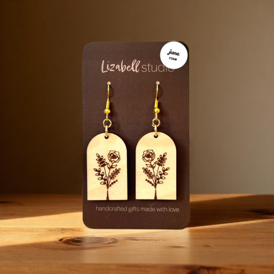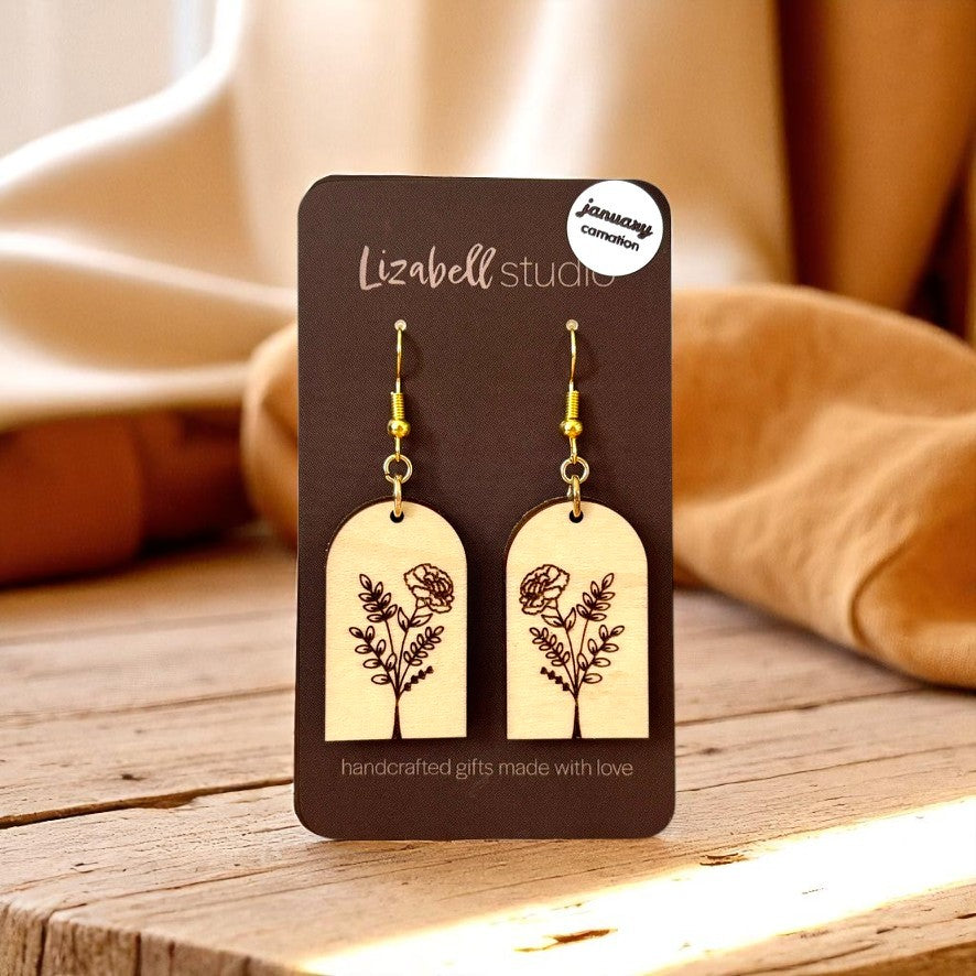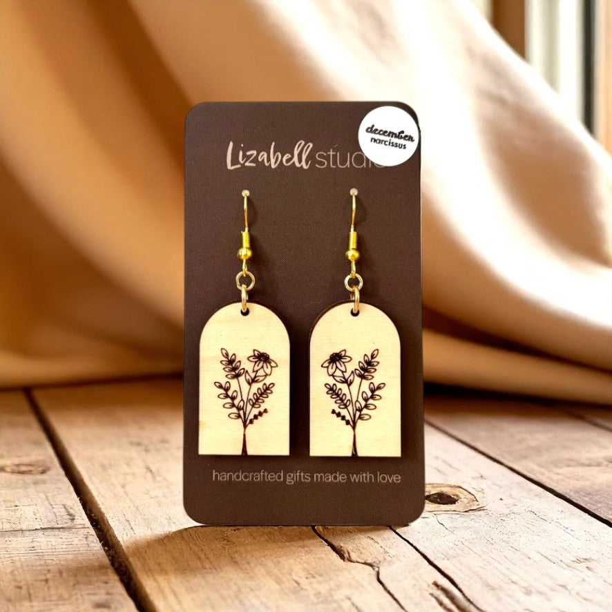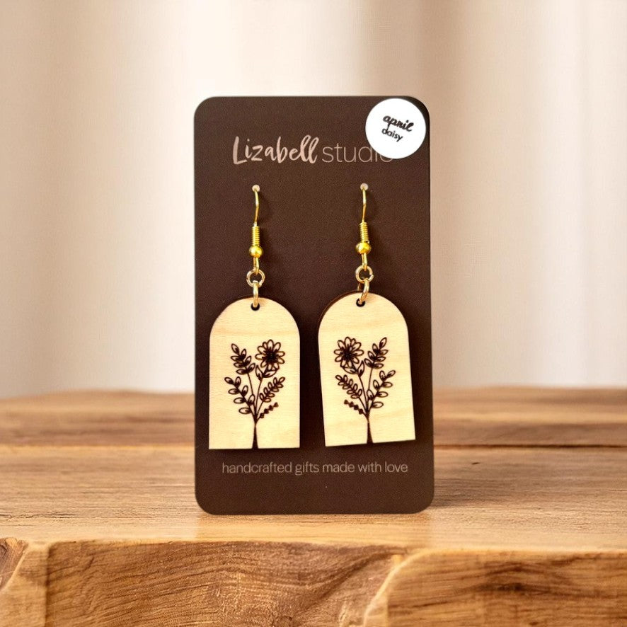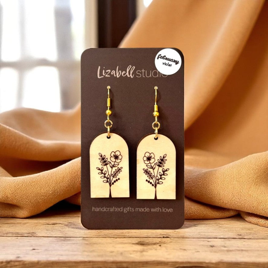 Celebrate the beauty of your story with our Birth Month Flower Bouquet Earrings. Each arch-shaped dangle is carefully crafted from lightweight maple wood and etched with a delicate bouquet—featuring lush greenery and your chosen birth month flower.