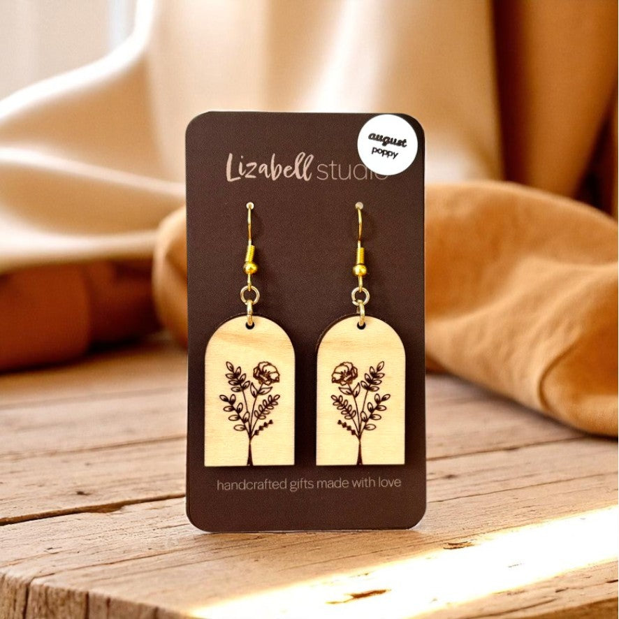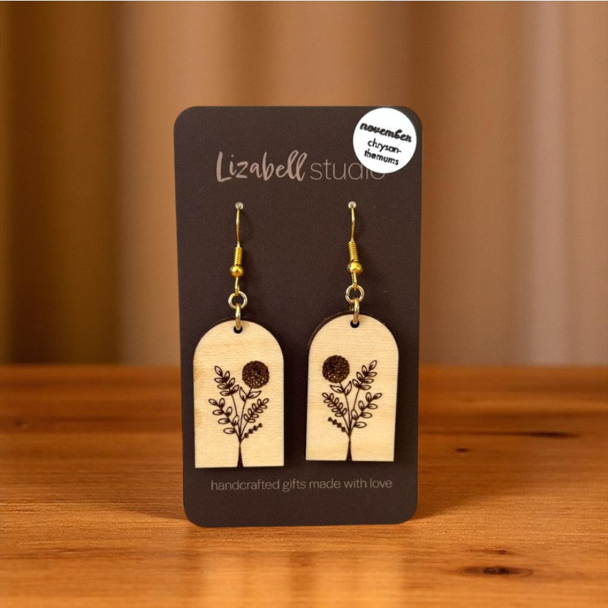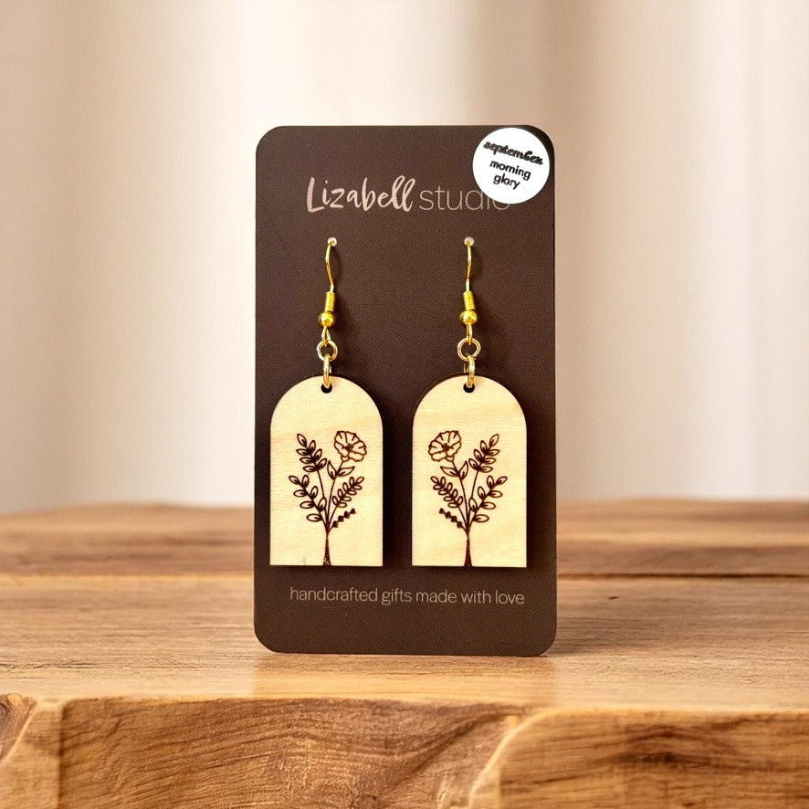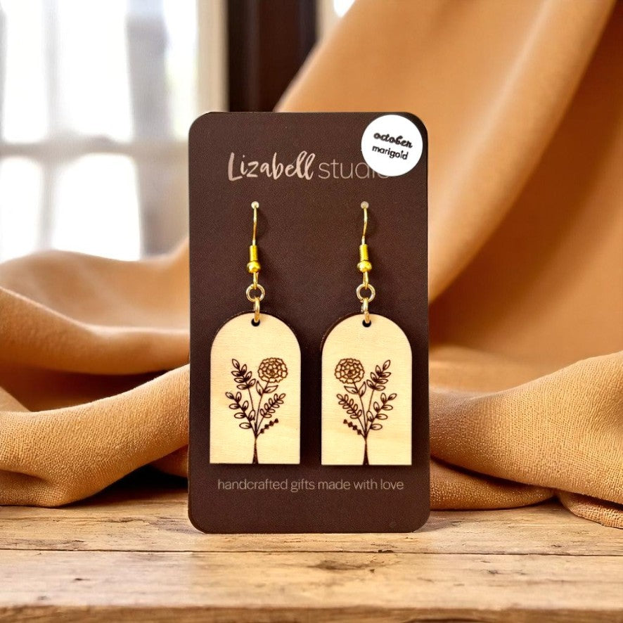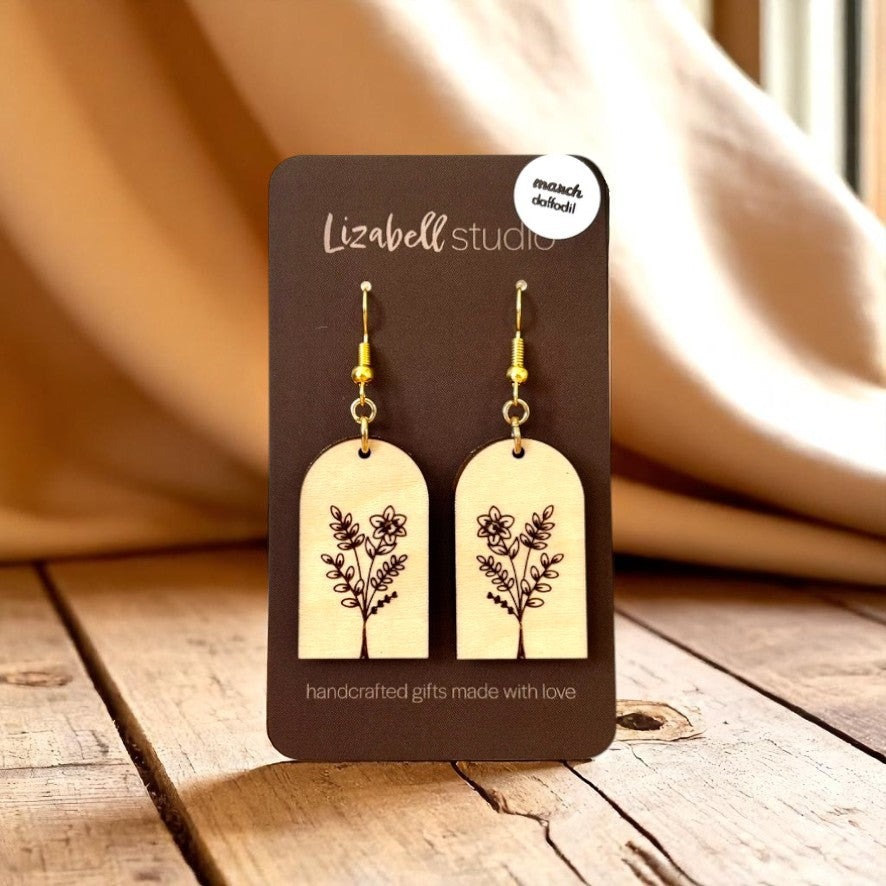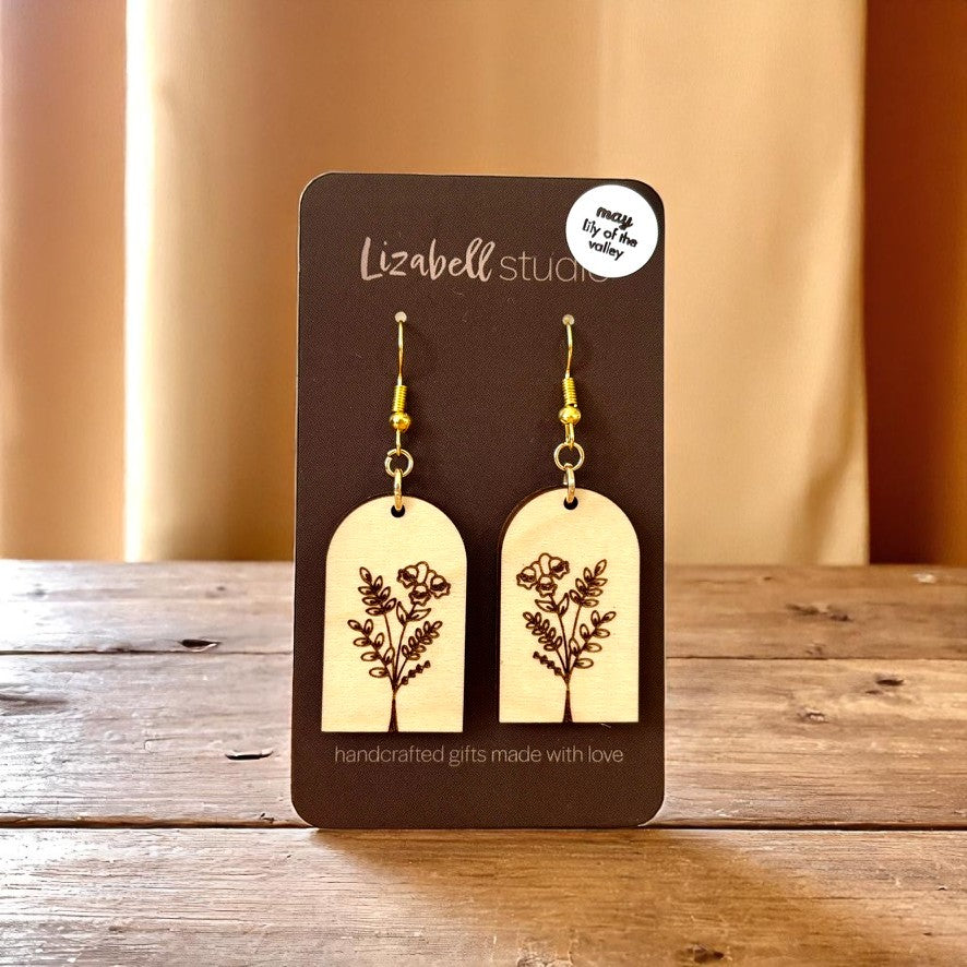 Celebrate the beauty of your story with our Birth Month Flower Bouquet Earrings. Each arch-shaped dangle is carefully crafted from lightweight maple wood and etched with a delicate bouquet—featuring lush greenery and your chosen birth month flower.