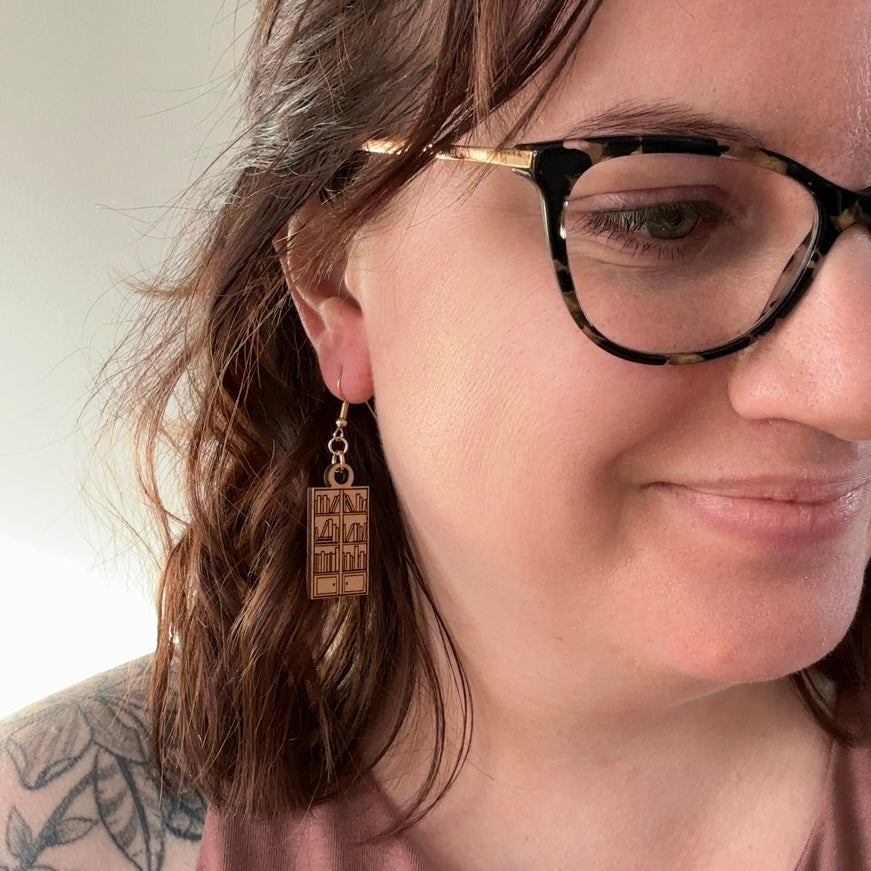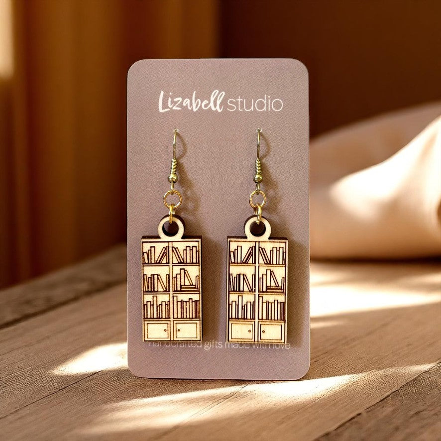 For book lovers who wear their passion proudly, the Book Nook Drops are the perfect accessory. Laser engraved with intricately detailed bookshelves on rectangular wooden pieces, these earrings capture the essence of a cozy reading nook.