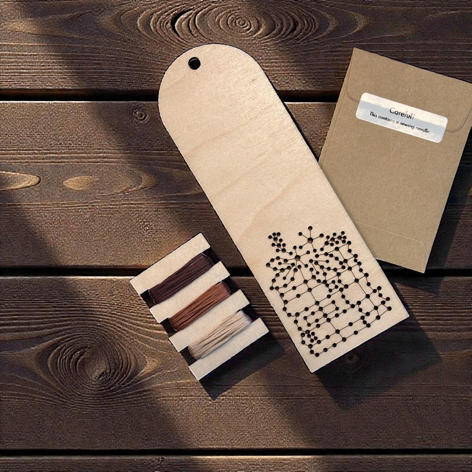 Each kit is thoughtfully designed and assembled in-house. The embroidery design is precisely laser cut into smooth maple wood, creating clean, easy-to-follow stitch guides. Every kit is hand-packed with care to ensure all components are included and ready for a seamless, beginner-friendly stitching experience.