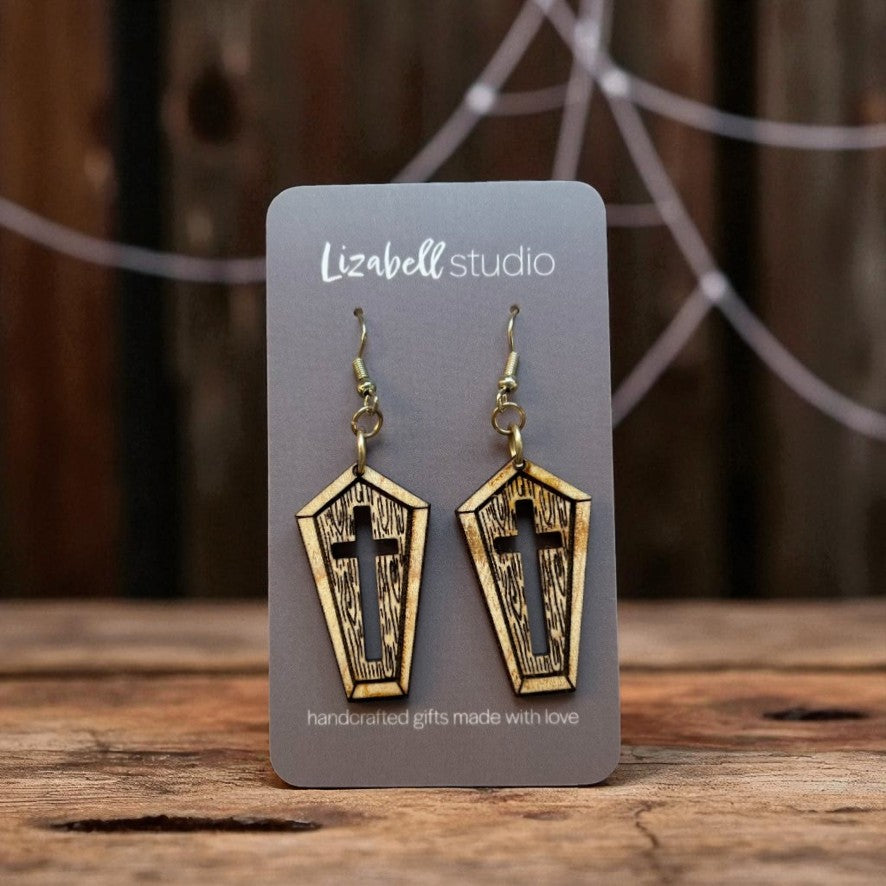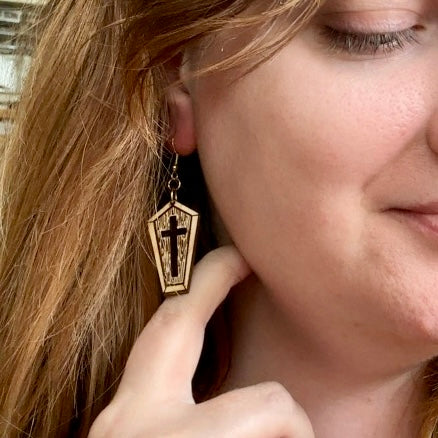Crafted from maple wood, these earrings are laser engraved and cut to feature a cross symbol cut out of the center, with delicate wood grain detailing.