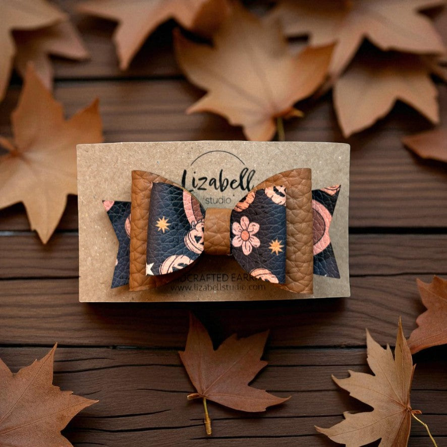 Handmade with three layers of two patterned vegan leathers, these bows bring fun textures and colors to any look.