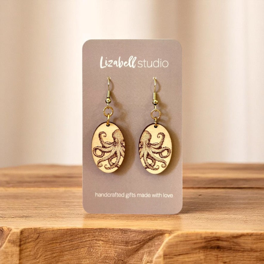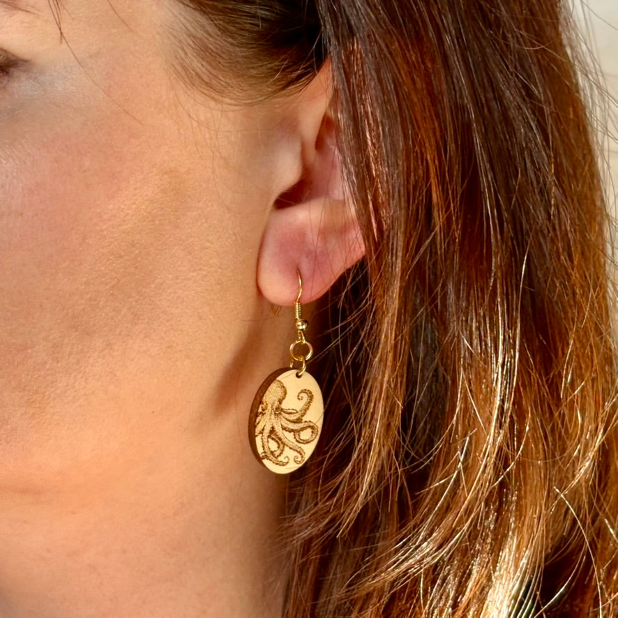 Make waves with our Tentacle Treasure Earrings, crafted from maple wood and laser-cut into intricate octopus designs.