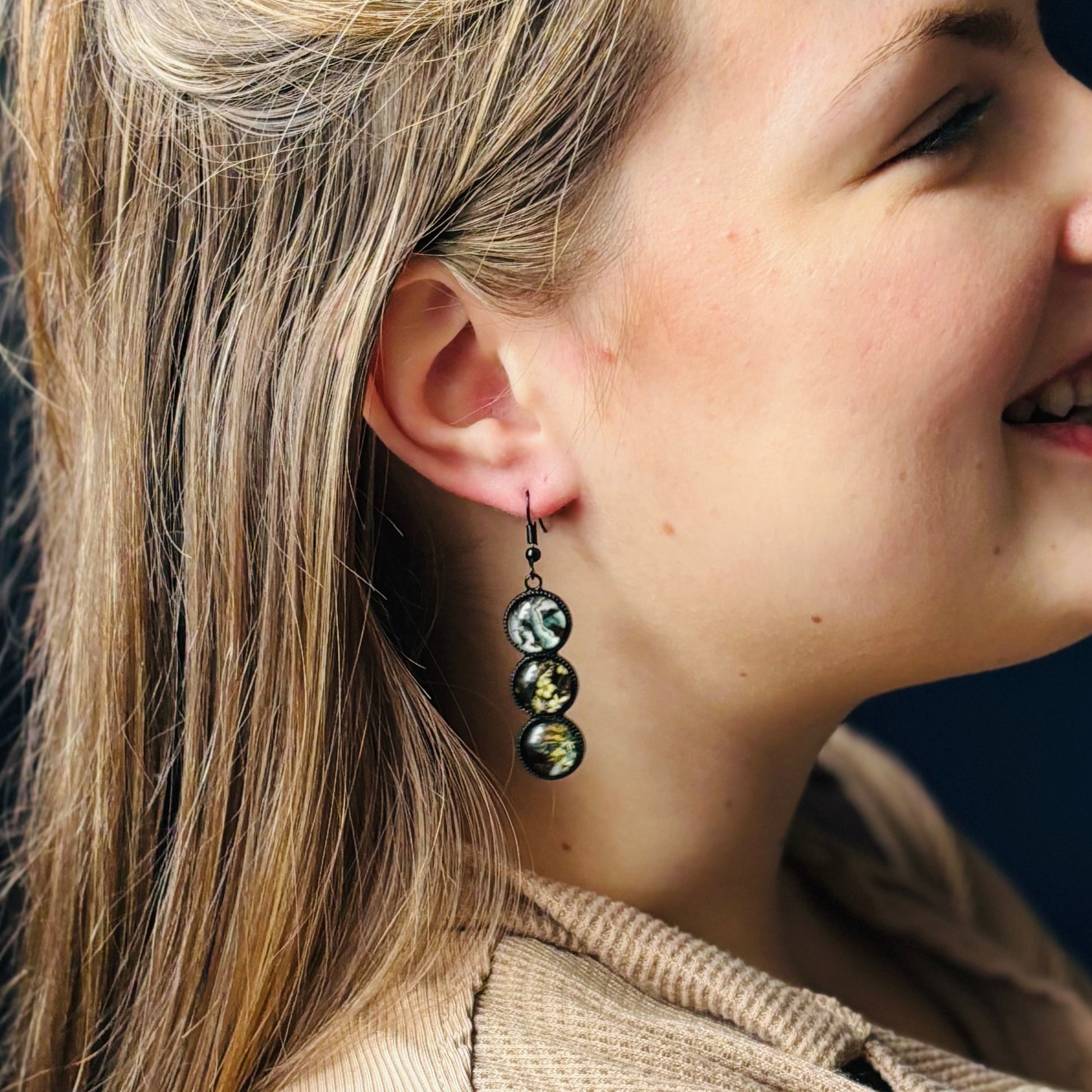 These chic cabochon earrings feature handcrafted glass cabochons, each adorned with three colorful designed stones.