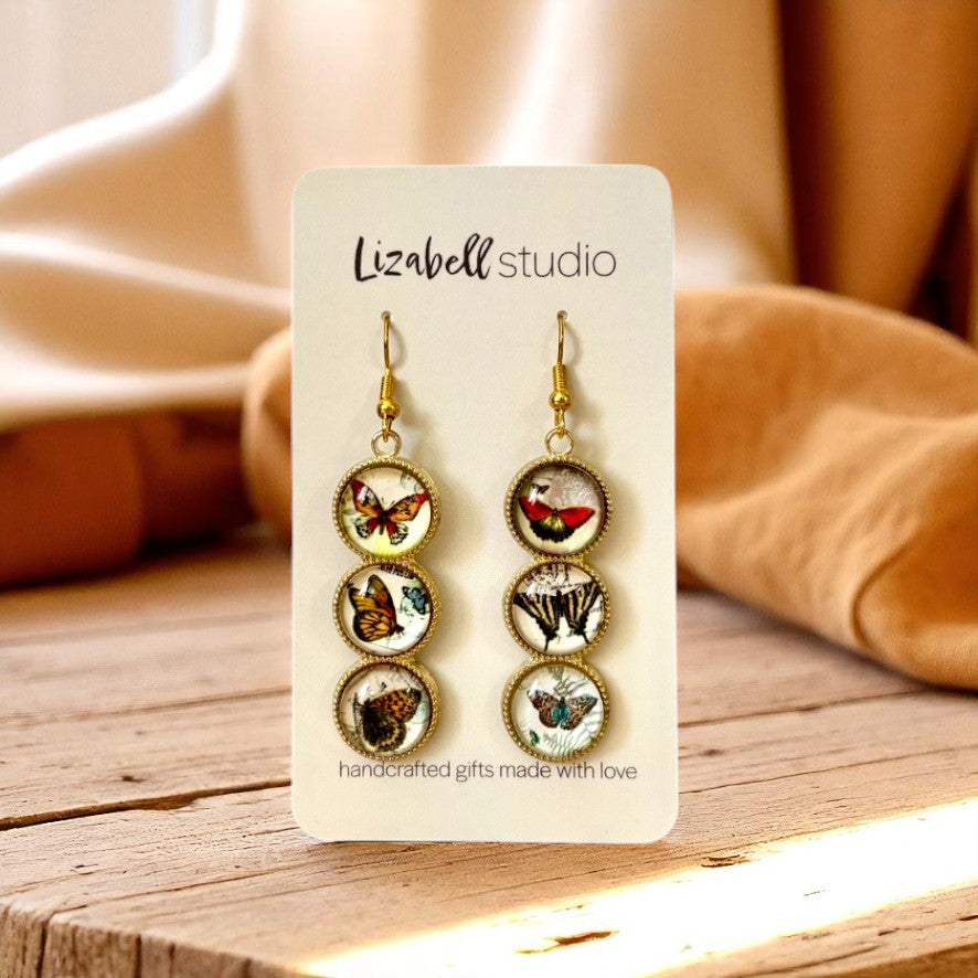 Each earring features a smooth, glass cabochon that magnifies and enhances the artwork beneath — from playful mushrooms to ethereal butterflies and dreamy abstracts. The cabochons provide a domed, polished finish that gives each design a tiny window-like effect.