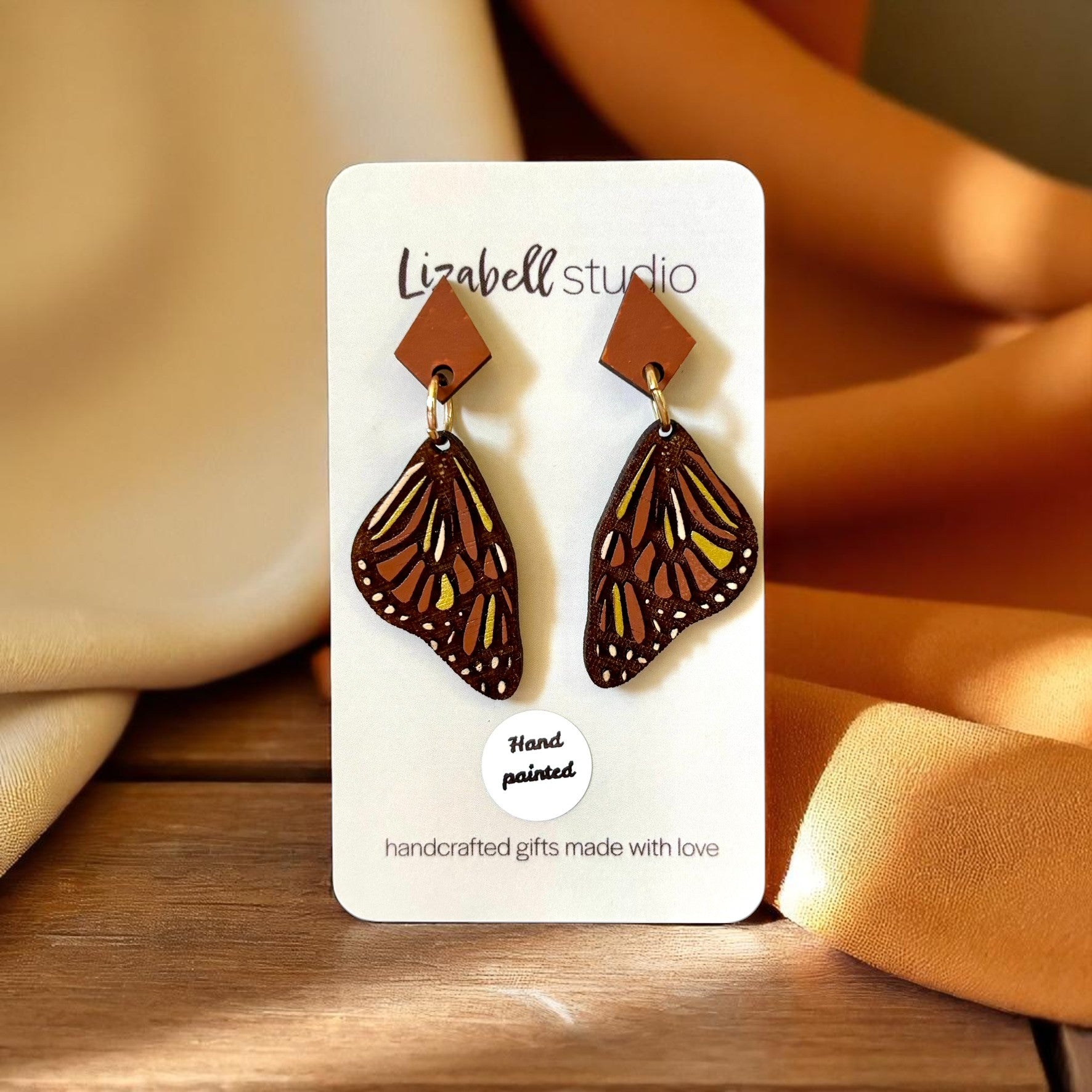 Catch a bit of migration magic with our Monarch Muse Earrings. Each maple-wood wing is hand-painted in warm sunset oranges and ochres, then sealed for a satin sheen.