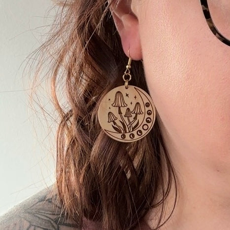 Crafted with intricate detail, these earrings feature laser-engraved designs of mushrooms, moons, stars, and elegant moon phases on each piece of wood.