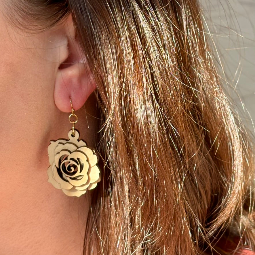 Elegance meets craftsmanship with the Rosewood Blooms Earrings. Made from maple wood, these earrings feature intricate, layered rose designs that bring depth and dimension to a timeless floral motif.