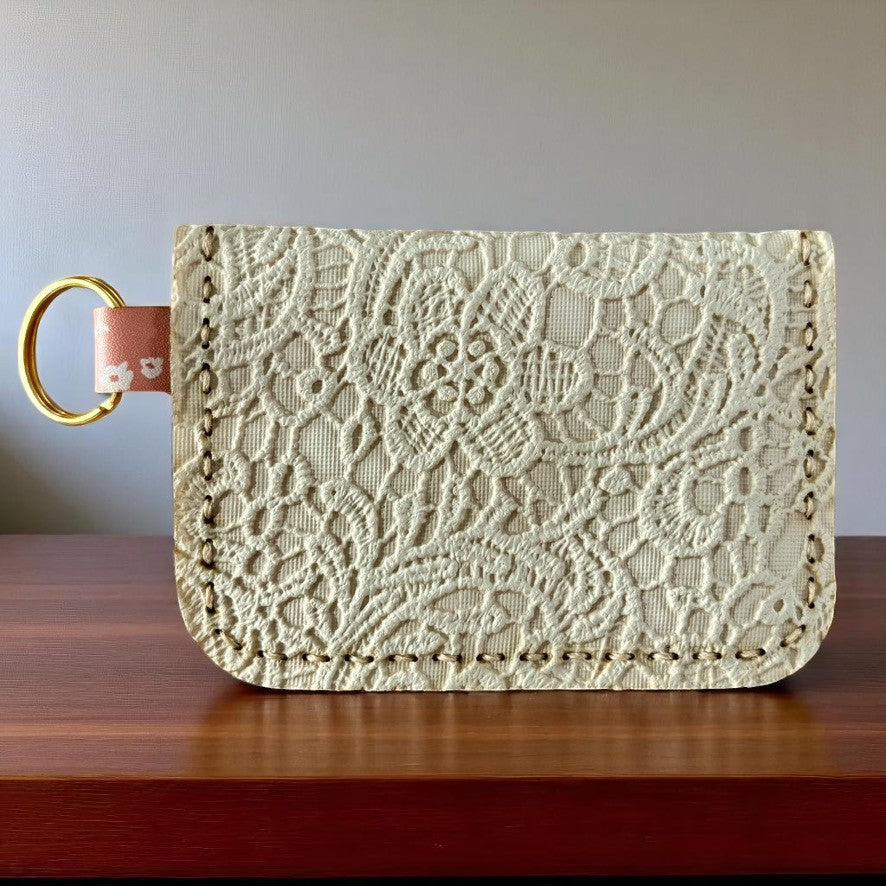 Featuring a delicate scallop design on the closure flap and a secure button clasp, this compact 3x4.25" pouch is perfect for cards, coins, or small treasures.