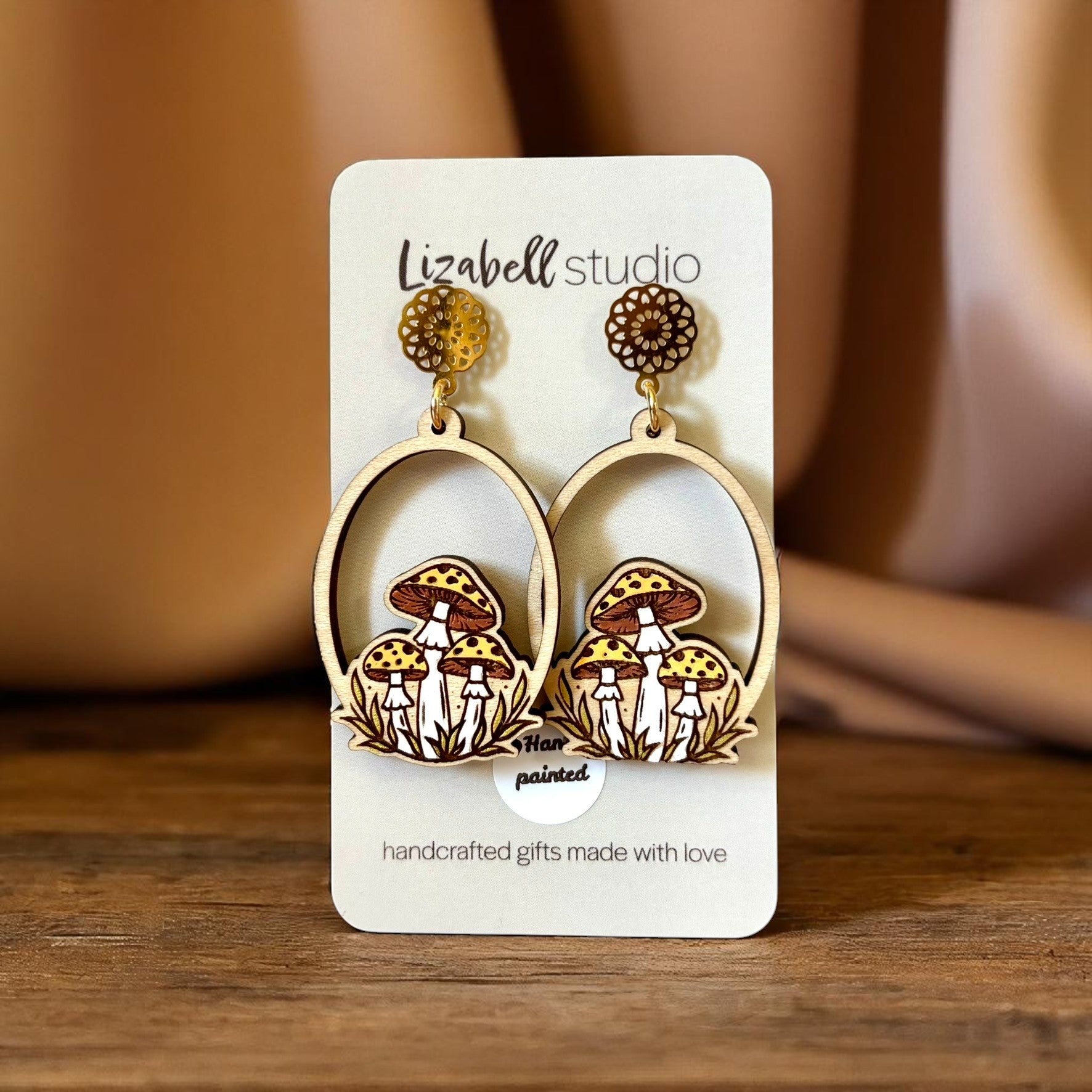 Step into the forest with these whimsical mushroom earrings, laser cut and hand-painted on warm maple wood. Featuring a trio of toadstools nestled in grassy detail and framed in a soft oval, each pair brings a touch of magic from the woodland floor to your ears.