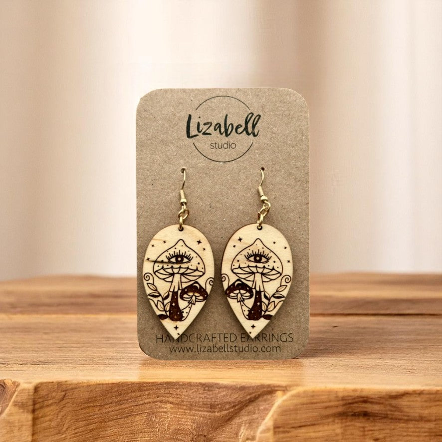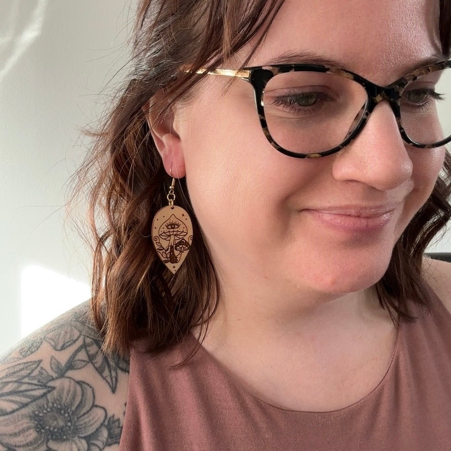 Our Shroom & Spell Drops are laser-engraved wooden earrings featuring whimsical mushroom designs, perfect for adding a touch of earthy magic to your look.