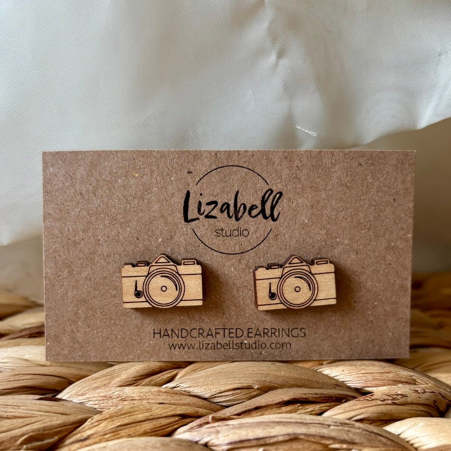 These minimalist wooden earrings are laser cut into the shape of vintage cameras, capturing the essence of timeless memories.