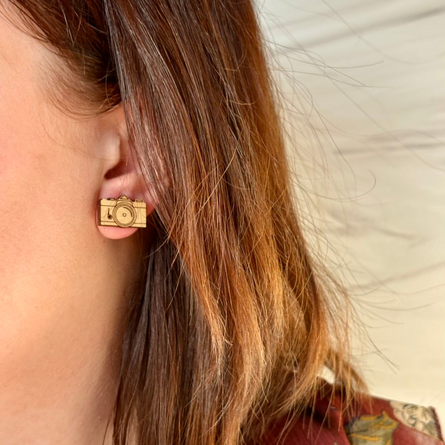 Made from maple wood, these earrings are perfect for photography lovers and vintage enthusiasts alike.