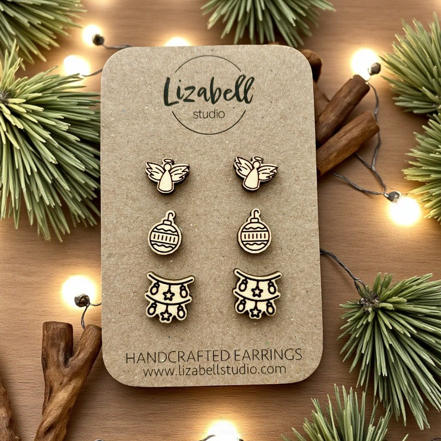 These maple wood studs feature a whimsical angel, a delicate ornament, and a string of twinkling lights, bringing the magic of Christmas tree decorating to your jewelry collection.