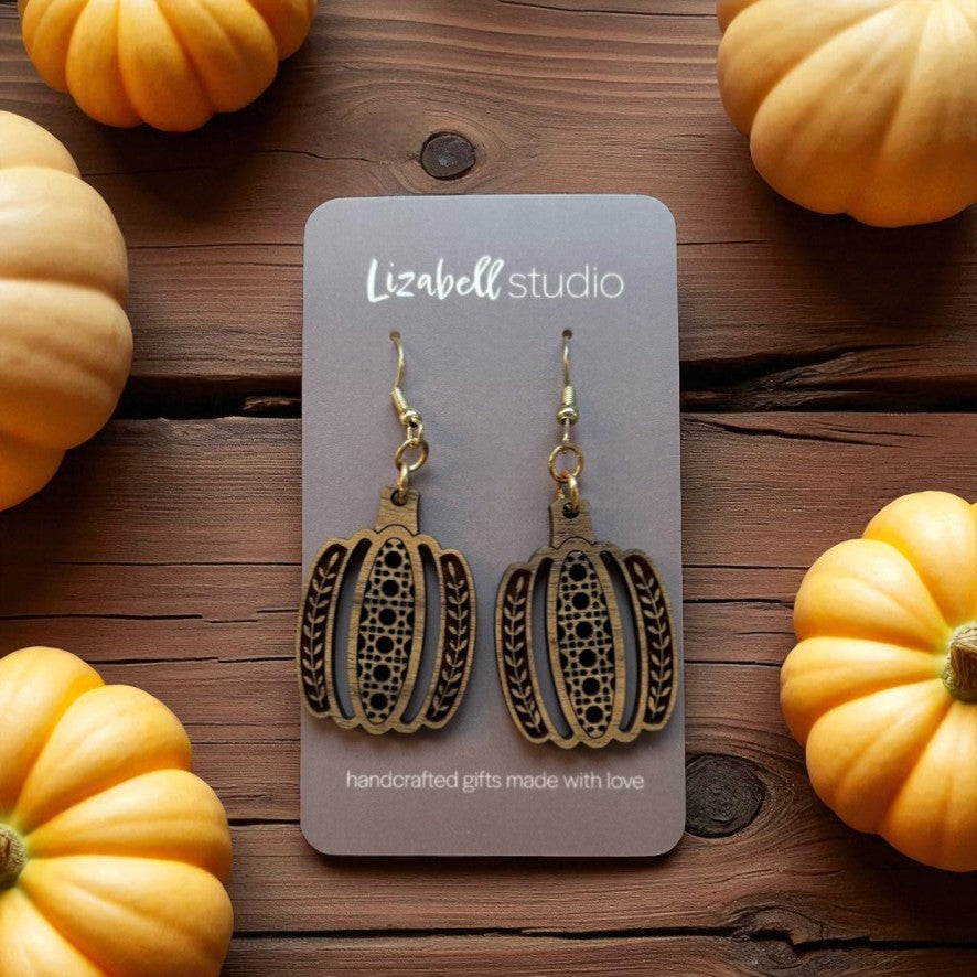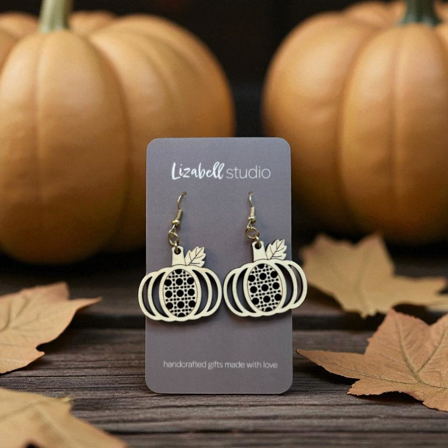 Our laser-cut Wooden Pumpkin Spice dangle earrings feature a unique rattan-inspired stripe design, adding a touch of boho flair to your fall wardrobe.