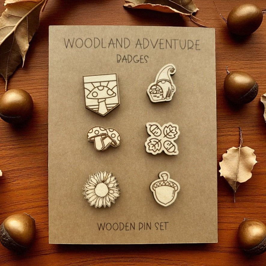 This enchanting set of six maple wood pins features intricate laser-engraved designs inspired by woodland adventures, including acorns, mushrooms, and sunflowers.