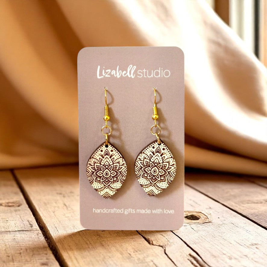 Elevate your accessory game with our Zen Flora Earrings. These lightweight wooden dangles feature an intricate mandala design that radiates symmetry and serenity.